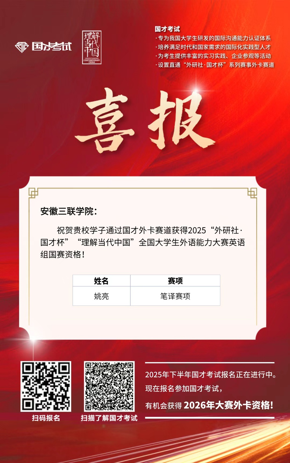 近日,2025“外研社・国才杯”“理解当代中国”全国大学生外语能力大赛组委会正式公布英语笔译赛项国赛外卡晋级名单,全国仅有14名选手晋级。我校文学部 2022级翻译专业学生姚亮凭借扎实的语言功底与出色的笔译素养成功入选,成为本省唯一一位晋级该赛项全国总决赛的选手。