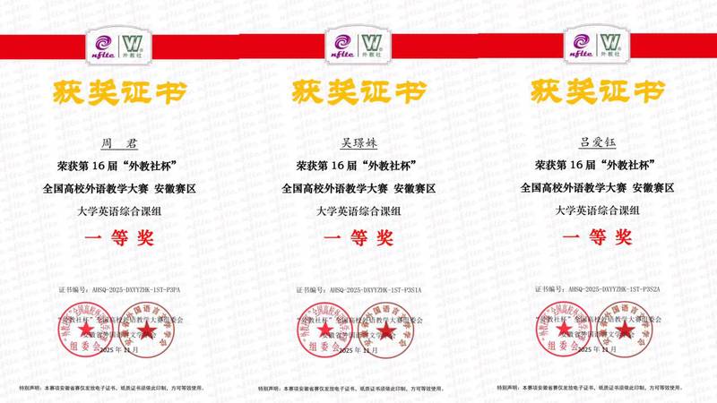 近日,第16届“外教社杯”全国高校外语教学大赛安徽赛区决赛成绩公布。文学部黄祖铭、余慧君、汪笑纯教师团队荣获大学英语视听说课组一等奖;周君、吴璟姝、吕爱钰教师团队荣获大学英语综合课组一等奖。我校比赛成绩位居全省高校前列。