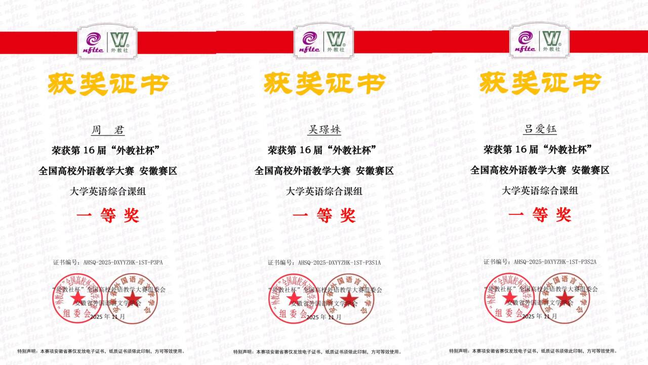 近日,第16届“外教社杯”全国高校外语教学大赛安徽赛区决赛成绩公布。文学部黄祖铭、余慧君、汪笑纯教师团队荣获大学英语视听说课组一等奖;周君、吴璟姝、吕爱钰教师团队荣获大学英语综合课组一等奖。我校比赛成绩位居全省高校前列。