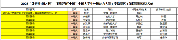 11月3日,2025年“外研社・国才杯”“理解当代中国”全国大学生外语能力大赛各赛项成绩正式揭晓。我校学子在多赛项表现亮眼,共斩获一等奖3 项、三等奖 4 项,其中翻译专业姚亮荣获“外研社・国才杯”笔译大赛安徽省决赛冠军。